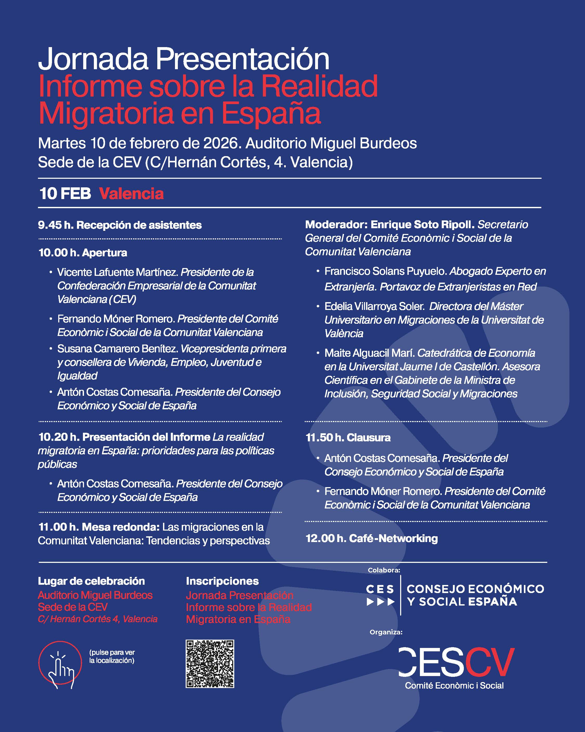06 de febrero de 2026 – El Comité Econòmic i Social de la Comunitat Valenciana (CES CV) celebrará el próximo martes 10 de febrero la Jornada de presentación del informe “La realidad migratoria en España: prioridades para las políticas públicas”, elaborado por el CES de España. El acto tendrá lugar en el Auditorio Miguel Burdeos, en la sede de la CEV, y reunirá a representantes institucionales, personas expertas y agentes sociales para analizar las principales tendencias migratorias con el objetivo de garantizar una gestión ordenada, segura y regular de los flujos migratorios.