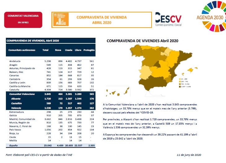 A la Comunitat Valenciana a l'abril de 2020 s'han realitzat 3.845 compravendes d'habitatges, un 33,70% menys que en el mateix mes de l'any anterior (5.799), descens causat pels efectes del COVID-19.