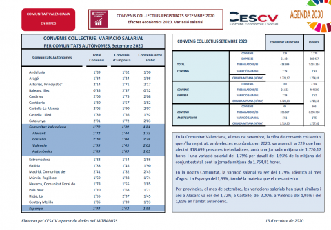 En la Comunitat Valenciana, el mes de setembre, la xifra de convenis col·lectius que s'ha registrat, amb efectes econòmics en 2020, va ascendir a 229 que han afectat 418.699 persones treballadores, amb una jornada mitjana de 1.720,17 hores i una variació salarial del 1,79% per davall del 1,93% de la mitjana del conjunt estatal, sent la jornada mitjana de 1.754,81 hores.